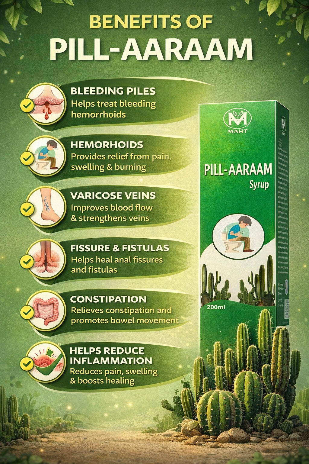 Pill-Aaraam is a ayurvedic syrup helpful in treating bleeding piles, haemorrhoids, fissures & fistulas, constipation, varicose veins and defecation. Its herbal blend helps reduce inflammation, relieve pain & burning, improve digestion & bowel movement, strengthen blood vessels and reduce swelling.